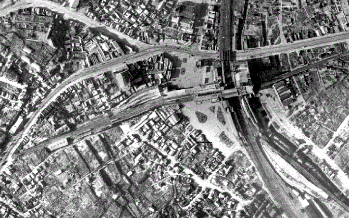 答120 当時の町の様子が鮮明の写し出されている米軍偵察機が撮影した空中写真で表しています。表紙では皇居で、高射砲陣地があったこともわかります。これらの空中写真は、アメリカ国立公文書館が所有していたものです。 写真は地理院地図(1945年の空中写真)から 東京渋谷駅付近