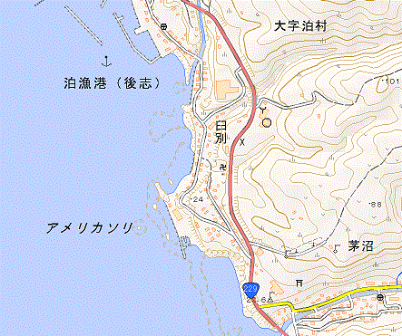 答79 アメリカソリです。右図は地理院地図ですが、載っています。「アメリカ・ソリ」という地名は、明治の頃に「アメリカ船が難破した」という故事に由来する地名とされているようなのですが、詳細はわかりませんでした。